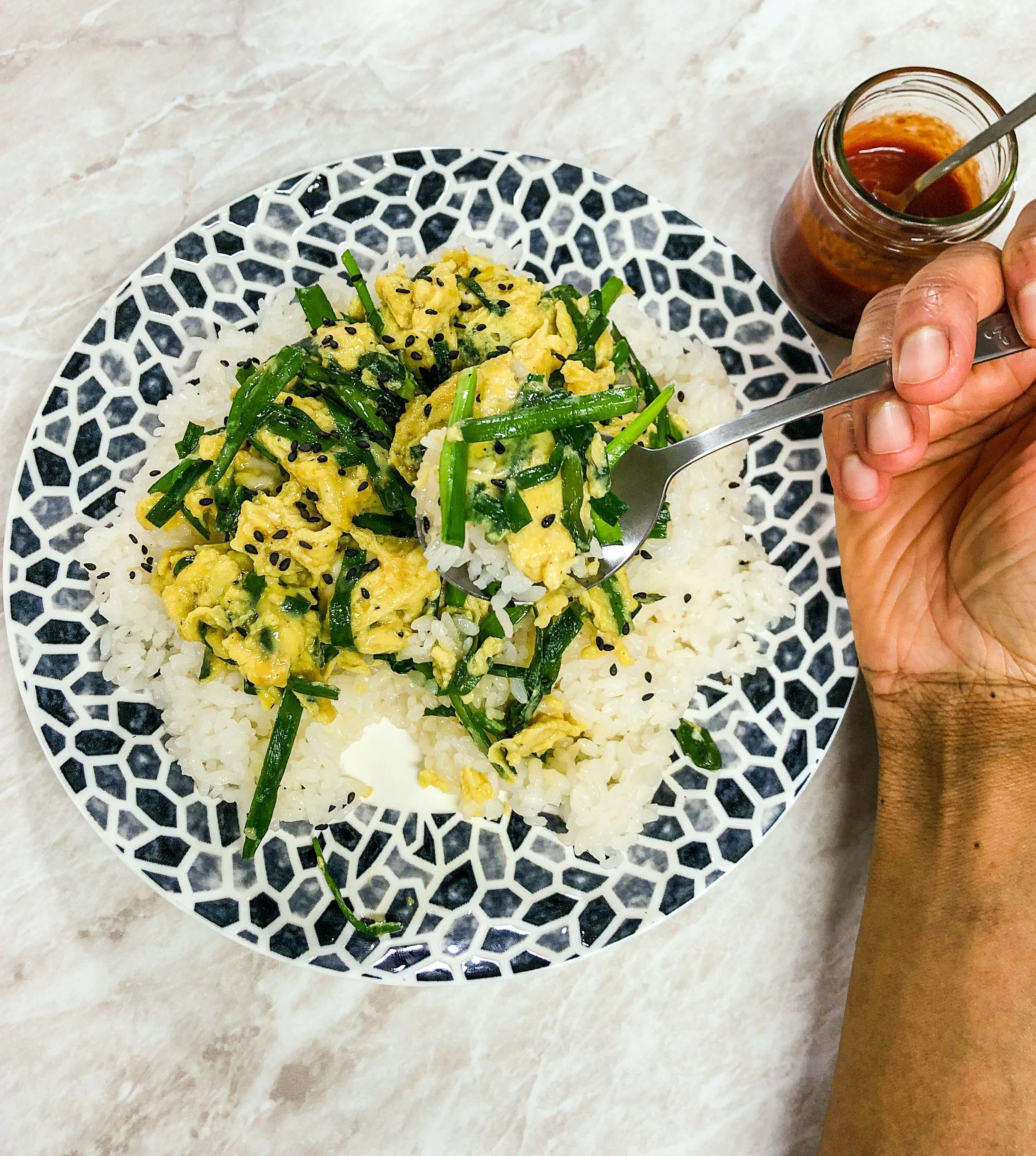 This simple meal comes together in the same amount of time it takes for the rice cooker to finish. Literally, start the rice then make the sauce. Cut the buchu or garlic chives (in English) and wait until the rice is finished. Fluff the finished rice, mix and cook the eggs and dinner is served! The result is silky seasoned eggs and herbaceous buchu atop hot rice. The gochujang ketchup is completely optional but I like the tangy spice it adds to round out an otherwise gentle dish.